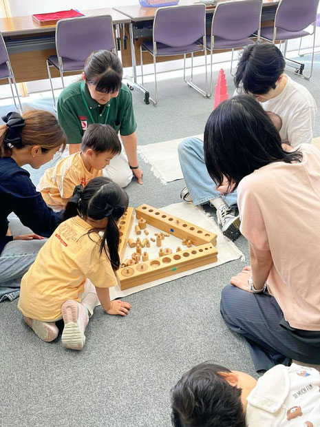 モンテッソーリ教育は、発達を促す子どものための活動ではりますが、実際に大人の方にやっていただくと、その奥深さ、活動の目的を実感していただくことができます。