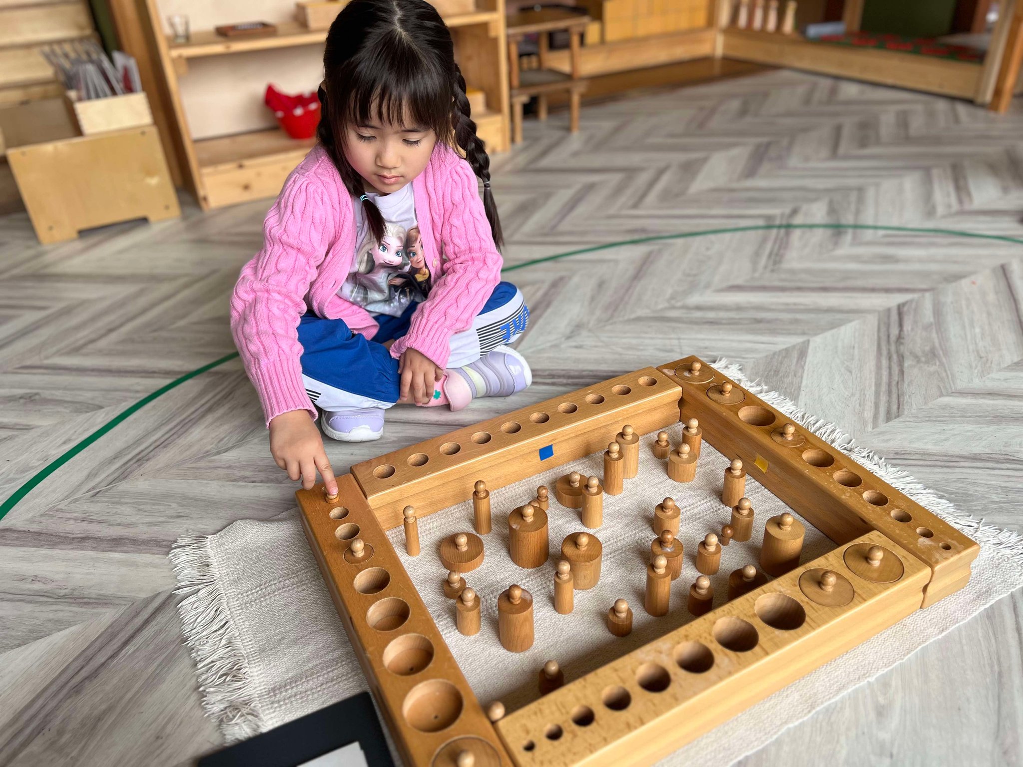 その「感覚教育」の代表的な活動の一つである「円柱さし」を体験していただいているひとコマです。